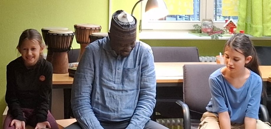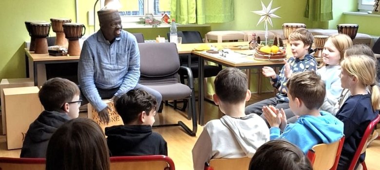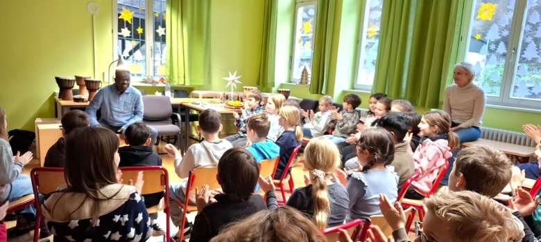 Ein vorzeitiges Weihnachtsgeschenk des Fördervereins war die Finanzierung einer Autorenlesung mit Ibrahima Ndiaye. Geboren im Senegal kam er 1992 nach Deutschland, weil er die deutsche Sprache liebt. Seitdem lebt er im Saarland, schreibt Bücher, tritt als Kabarettist auf, moderiert verschiedene Veranstaltungen und geht in Schulen, um Kindern die Freude an Sprache zu vermitteln. Durch seine sehr präsente Art, durch die starke Mimik und Gestik zieht er die Kinder in seinen Bann. So erzählte er, wie er als Kind die Schule im Senegal erlebt hat, sang, trommelte und tanzte zu afrikansichen Liedern mit den Kindern und bezog sie als kleine Schauspielerinnen und Schauspieler in seine Erzählungen mit ein.