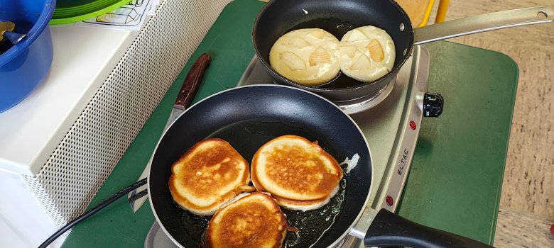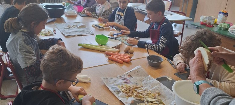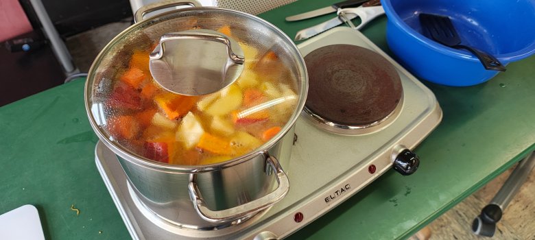 Anschließend wurde in den Klassen fleißig gekocht. So gab es frischen Obstsalat und leckere Gemüsesticks, Kürbissuppe mit Apfelküchle, gesunde Jogurt-Dinkel-Waffeln mit Apfelmus, Feldsalat und auch die Pälzer Grumbeersupp durfte nicht fehlen.