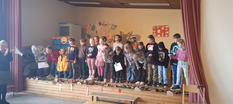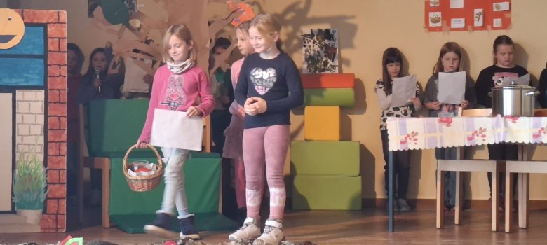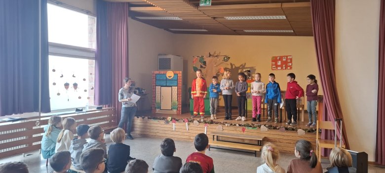 Die dritte Klasse, die auch für ein herbstliches Bühnenbild gesorgt hatte, erzählte in einer kleinen Geschichte, was alles zum Herbst gehört und wie vielfältig die Erlebnisse in dieser farbenfrohen Jahreszeit sein können.