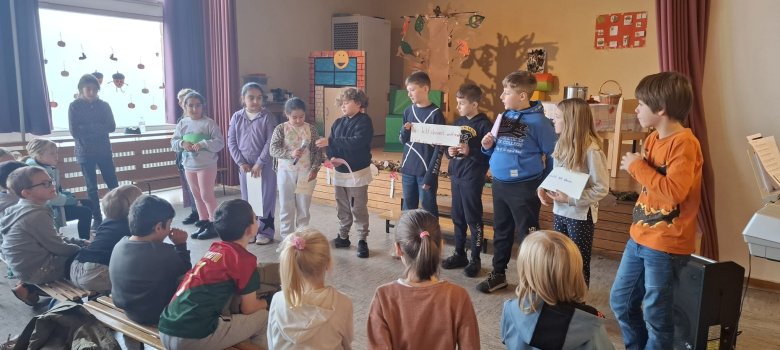 Die vierte Klasse trug gemeinsam das Gedicht „Oktober“ vor und nahm in ihrem Lied „Gruselsong“ Bezug auf Halloween. Außerdem hatten die Großen noch Regeln auf Satzstreifen vorbereitet, die sie allen Kindern näherbrachten, um für ein noch besseres und friedvolles Miteinander zu werben.