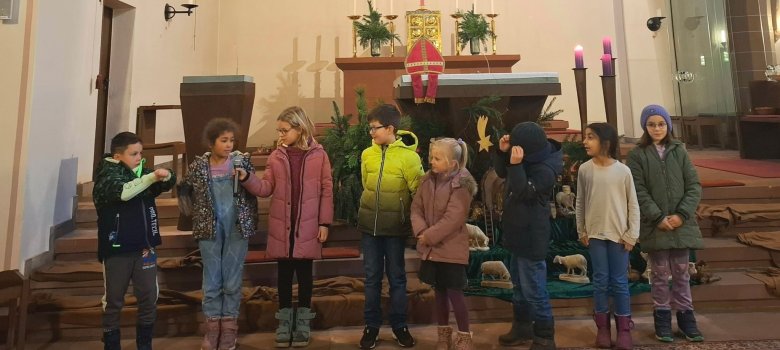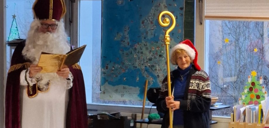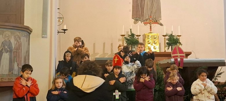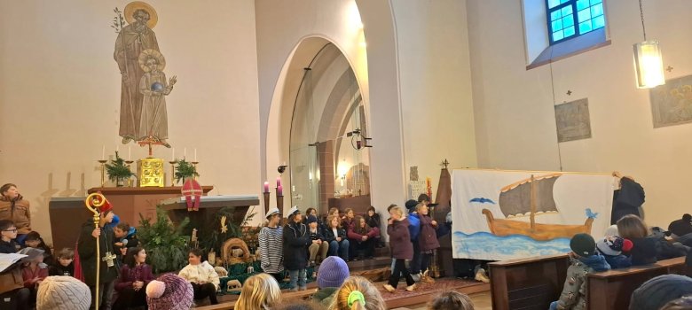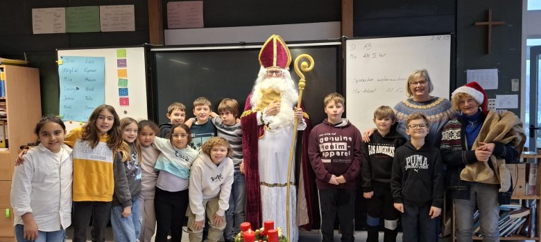 Am 04. Dezember versammelte sich die gesamte Schulgemeinschaft in der katholischen Kirche. Religionslehrerin Eve Buchholz und Pfarrer Frank Wiehler hatten in den zurückliegenden Wochen ein Nikolausmusical mit den Kindern der dritten und vierten Klasse einstudiert, das die Geschichte des Heiligen Nikolaus erzählt. Gekonnt spielten die Kinder die Geschichte vor und sangen mit Begeisterung die Lieder.